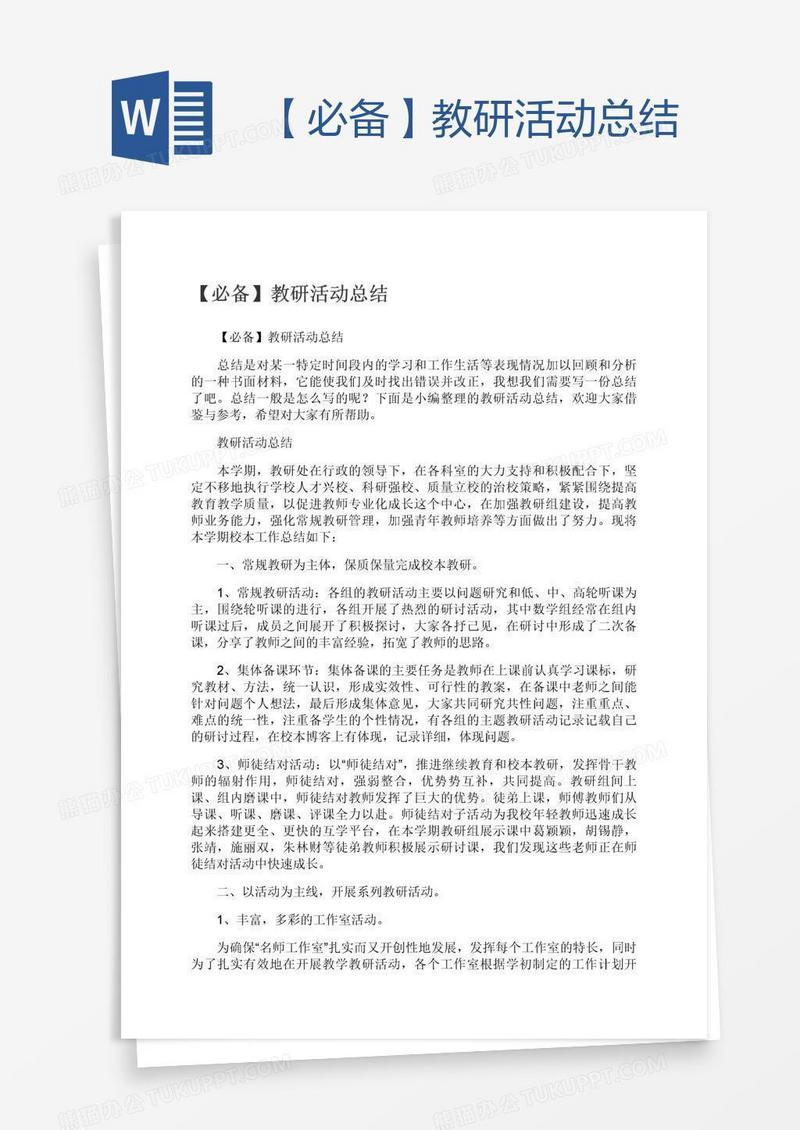 本作品为【必备】教研活动总结, 编号:w9jveyd2g9, 格式为 docx, 大小1 MB, 本作品下载后,先解压,解压之后用推荐软件 Word(2010) 打开, 然后进行编辑功能。