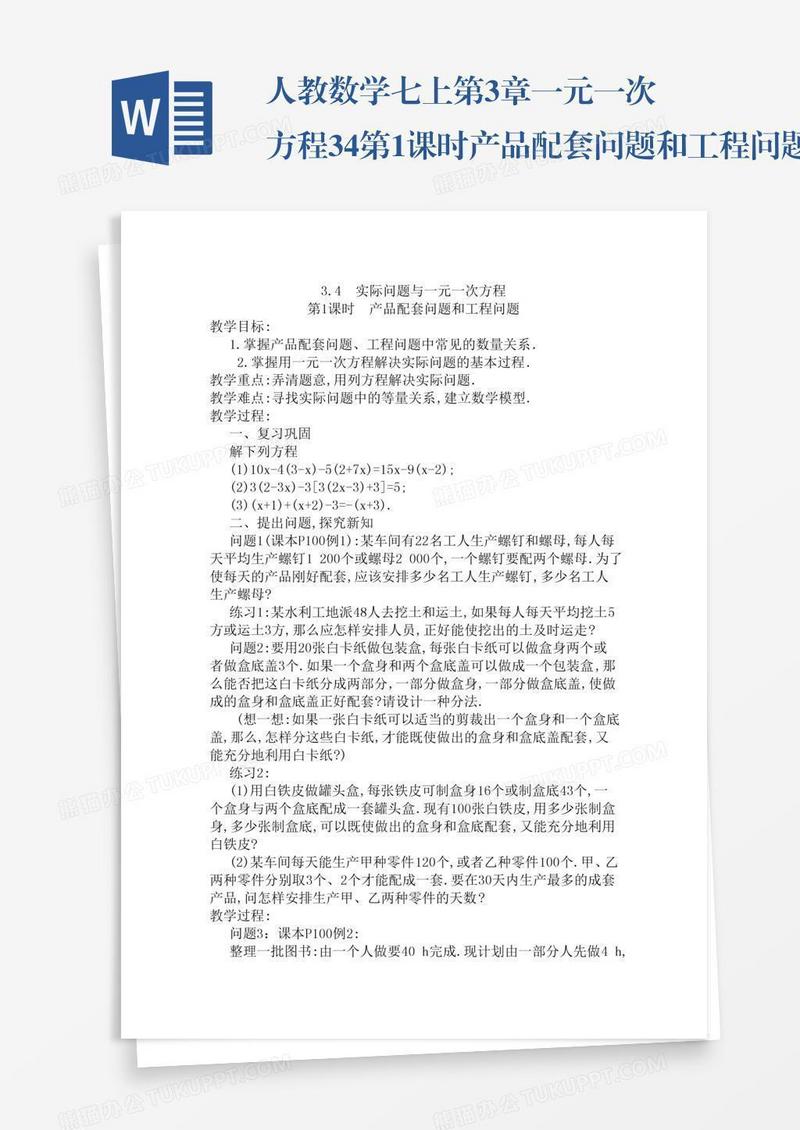 本作品为人教数学七上第3章一元一次方程3.4第1课时产品配套问题和工程问题, 编号:w9jvl7wj49, 格式为 docx, 大小1 MB, 本作品下载后,先解压,解压之后用推荐软件 Word(2010) 打开, 然后进行编辑功能。