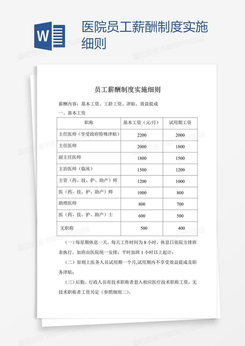 本作品为医院员工薪酬制度实施细则, 编号:w9ke0j00b9, 格式为 doc, 大小1 MB, 本作品下载后,先解压,解压之后用推荐软件 Word(2010) 打开, 然后进行编辑功能。