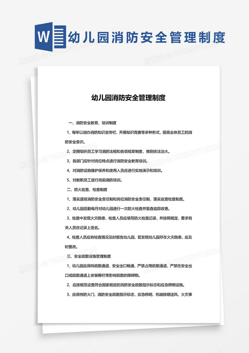 本作品为幼儿园消防安全管理制度word模板, 编号:w9ke0poyv9, 格式为 docx, 大小1 MB, 本作品下载后,先解压,解压之后用推荐软件 Word(2019) 打开, 然后进行编辑功能。