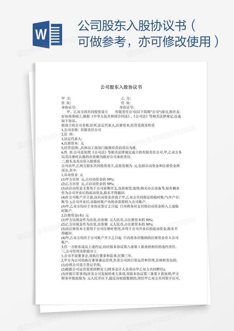 本作品为公司股东入股协议书(可做参考,亦可修改使用), 编号:w9ke0ylnv9, 格式为 doc, 大小1 MB, 本作品下载后,先解压,解压之后用推荐软件 Word(2010) 打开, 然后进行编辑功能。