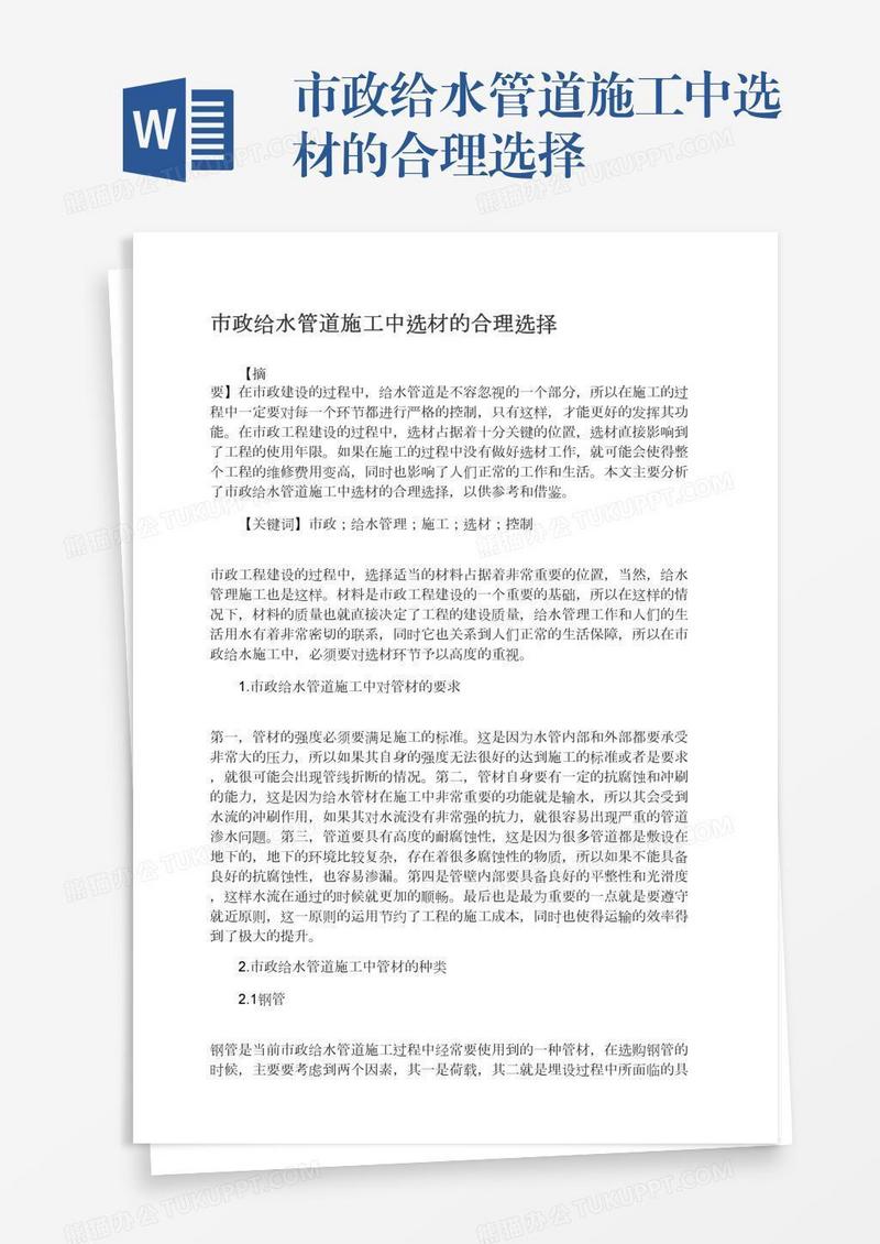 本作品为市政给水管道施工中选材的合理选择, 编号:w9ke33w5y9, 格式为 docx, 大小1 MB, 本作品下载后,先解压,解压之后用推荐软件 Word(2010) 打开, 然后进行编辑功能。