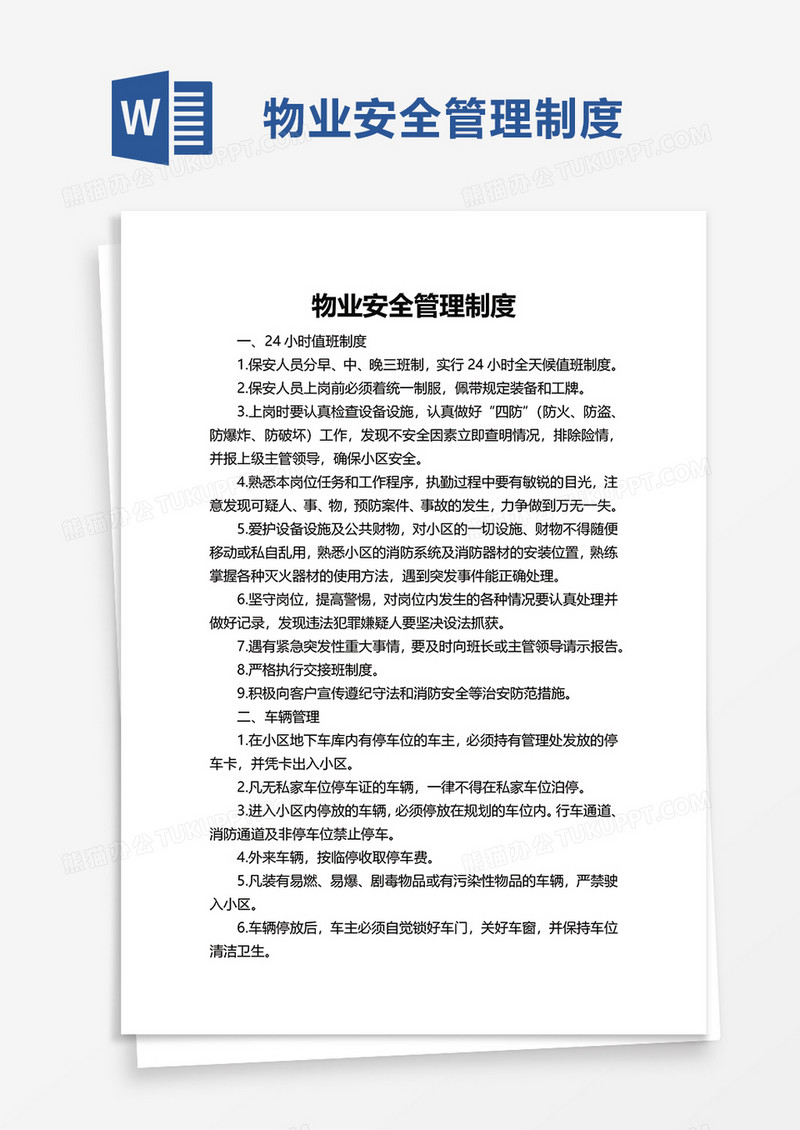 本作品为物业安全管理制度word模板, 编号:w9ke3bbv49, 格式为 docx, 大小1 MB, 本作品下载后,先解压,解压之后用推荐软件 Word(2019) 打开, 然后进行编辑功能。