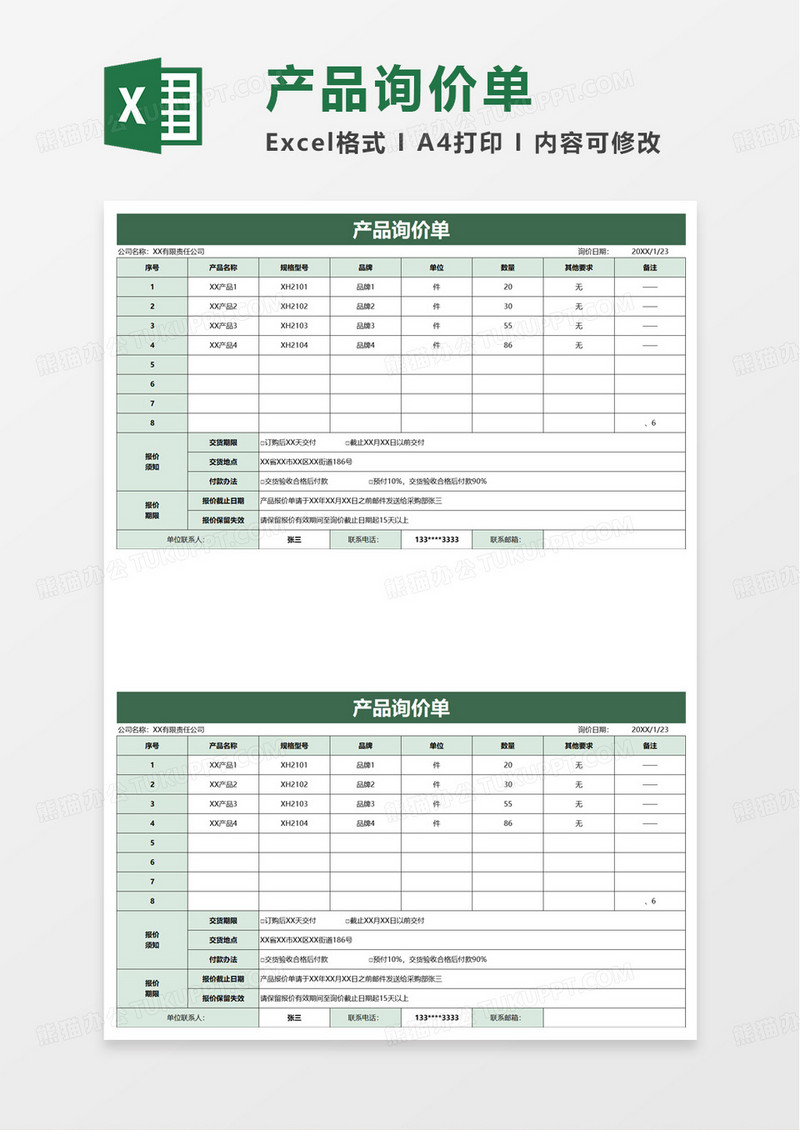 本作品为产品询价单excel模板, 编号:w9ke3l6wy9, 格式为 xlsx, 大小1 MB, 本作品下载后,先解压,解压之后用推荐软件 Excel(2016) 打开, 然后进行编辑功能。