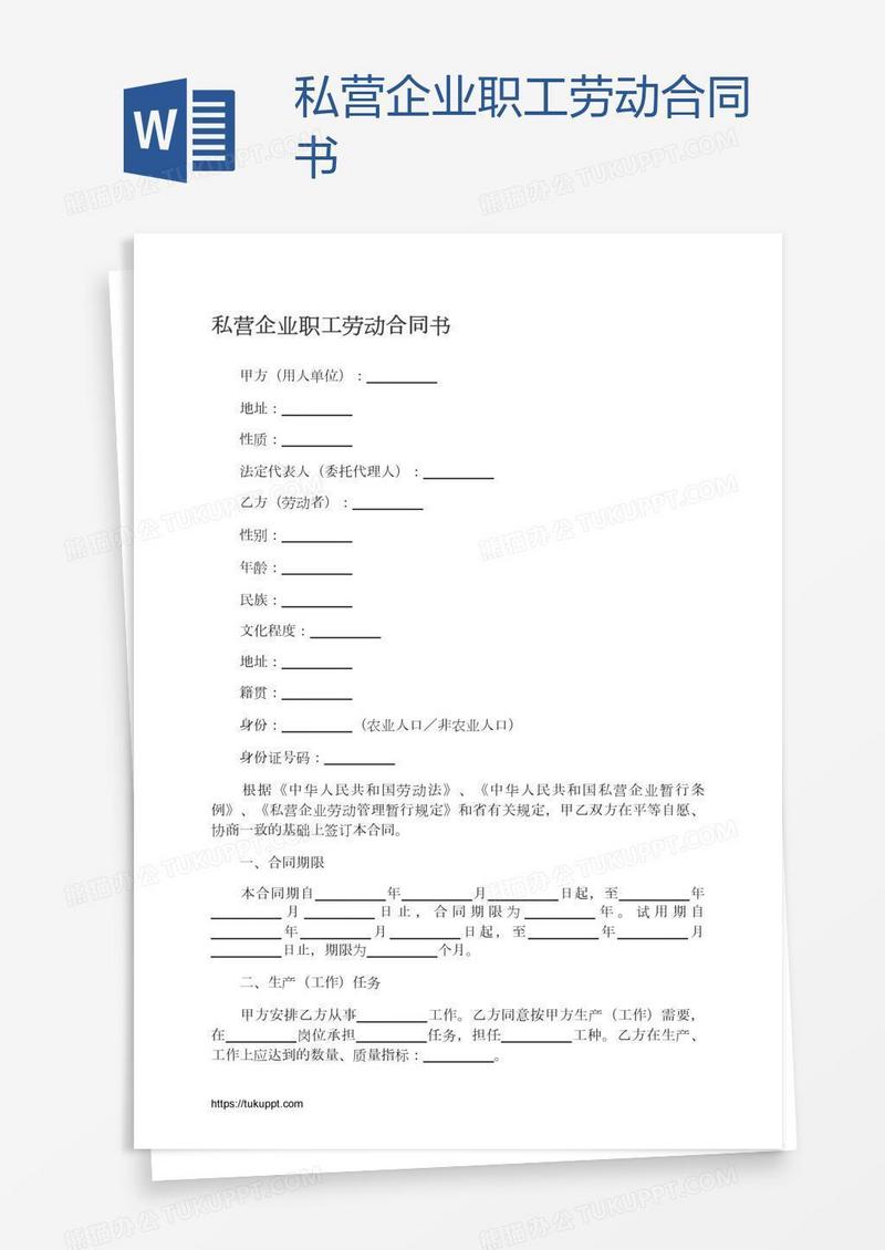 本作品为私营企业职工劳动合同书, 编号:w9keq0q8y9, 格式为 docx, 大小1 MB, 本作品下载后,先解压,解压之后用推荐软件 Word(2010) 打开, 然后进行编辑功能。