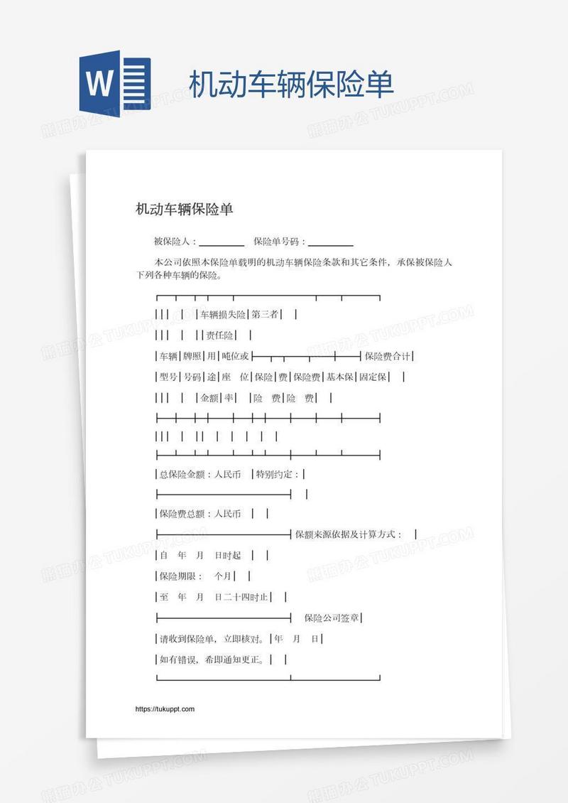本作品为机动车辆保险单, 编号:w9keq0rg49, 格式为 docx, 大小1 MB, 本作品下载后,先解压,解压之后用推荐软件 Word(2010) 打开, 然后进行编辑功能。