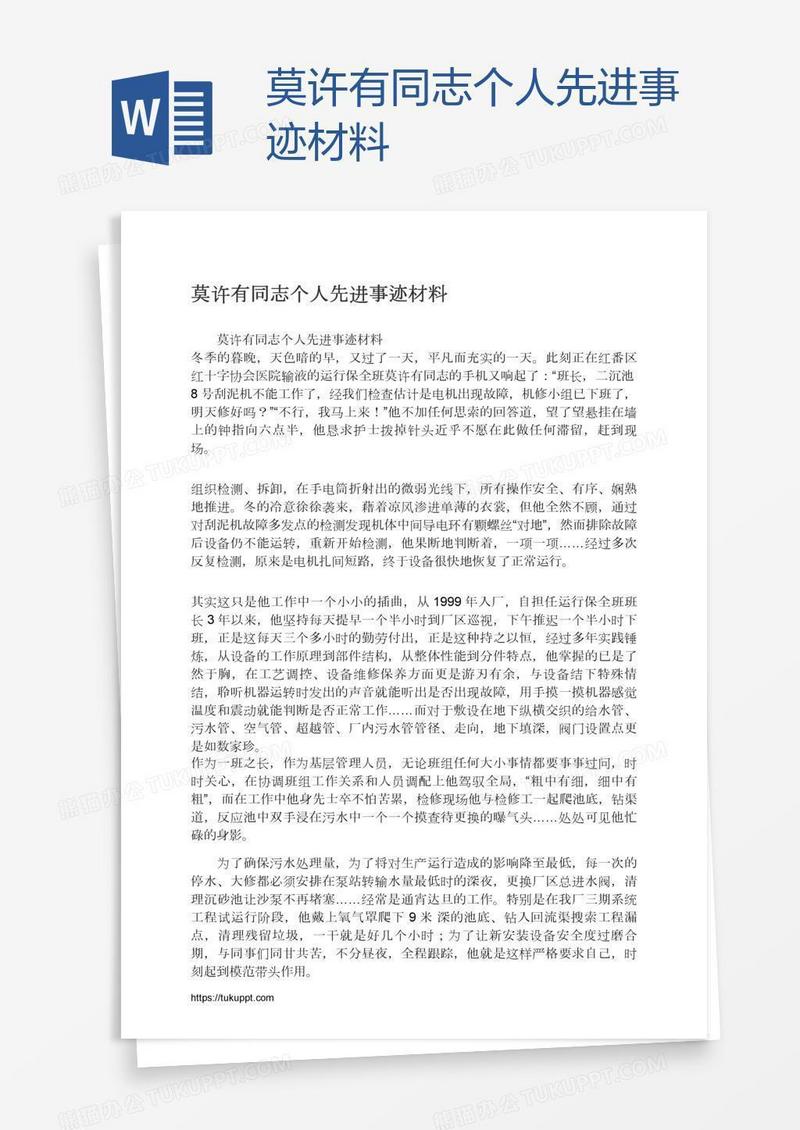 本作品为莫许有同志个人先进事迹材料, 编号:w9keq2q6d9, 格式为 docx, 大小1 MB, 本作品下载后,先解压,解压之后用推荐软件 Word(2010) 打开, 然后进行编辑功能。