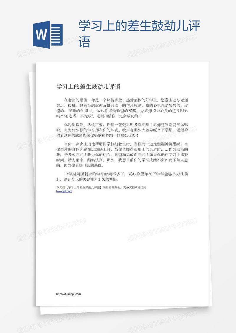 本作品为学习上的差生鼓劲儿评语, 编号:w9keqel849, 格式为 docx, 大小1 MB, 本作品下载后,先解压,解压之后用推荐软件 Word(2010) 打开, 然后进行编辑功能。