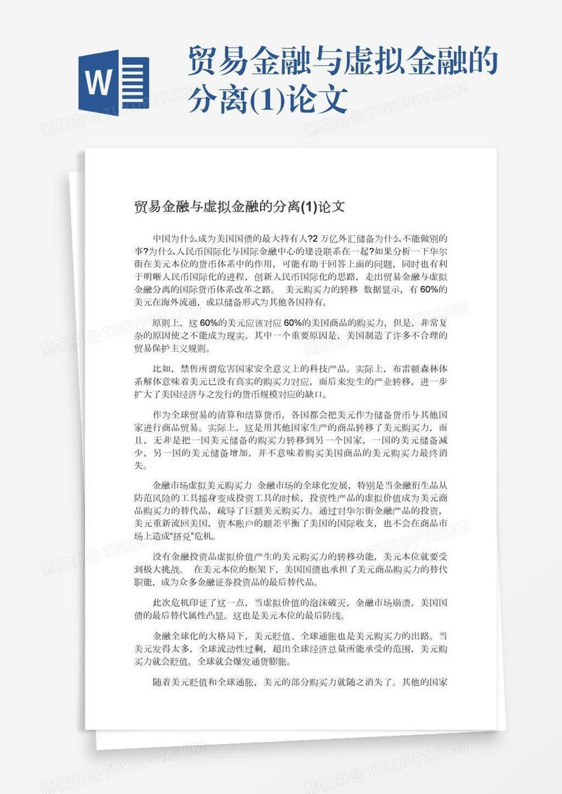 本作品为贸易金融与虚拟金融的分离(1)论文, 编号:w9keqpo049, 格式为 docx, 大小1 MB, 本作品下载后,先解压,解压之后用推荐软件 Word(2010) 打开, 然后进行编辑功能。