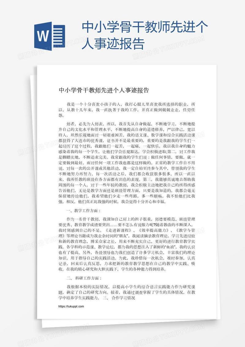 本作品为中小学骨干教师先进个人事迹报告, 编号:w9keqrqq49, 格式为 docx, 大小1 MB, 本作品下载后,先解压,解压之后用推荐软件 Word(2010) 打开, 然后进行编辑功能。