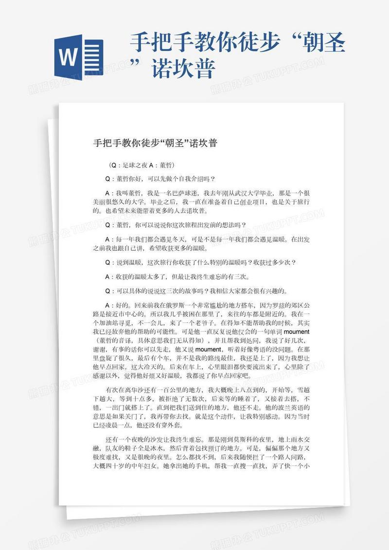 本作品为手把手教你徒步“朝圣”诺坎普, 编号:wavqd07ww9, 格式为 docx, 大小1 MB, 本作品下载后,先解压,解压之后用推荐软件 Word(2010) 打开, 然后进行编辑功能。