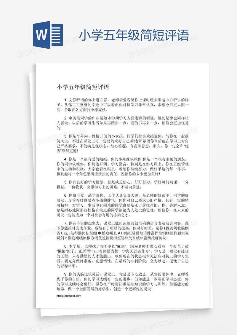 本作品为小学五年级简短评语, 编号:wavqd26l29, 格式为 docx, 大小1 MB, 本作品下载后,先解压,解压之后用推荐软件 Word(2010) 打开, 然后进行编辑功能。