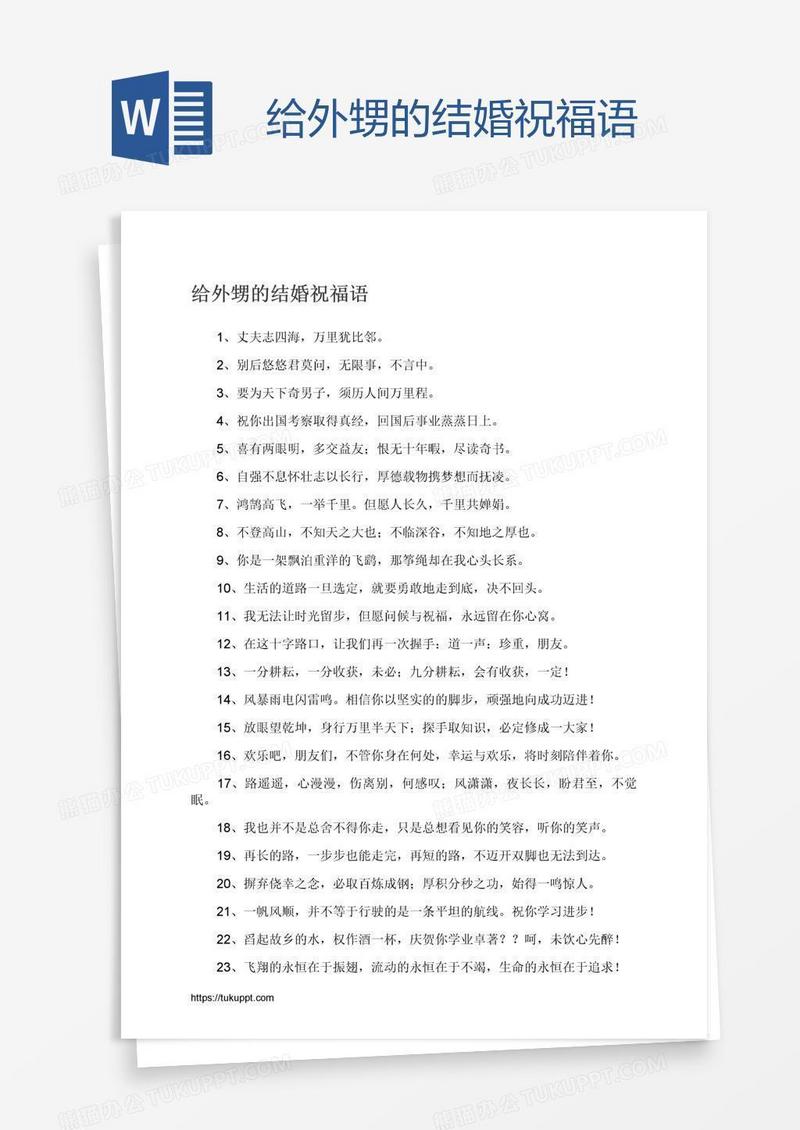 本作品为给外甥的结婚祝福语, 编号:wavqd28g79, 格式为 docx, 大小1 MB, 本作品下载后,先解压,解压之后用推荐软件 Word(2010) 打开, 然后进行编辑功能。