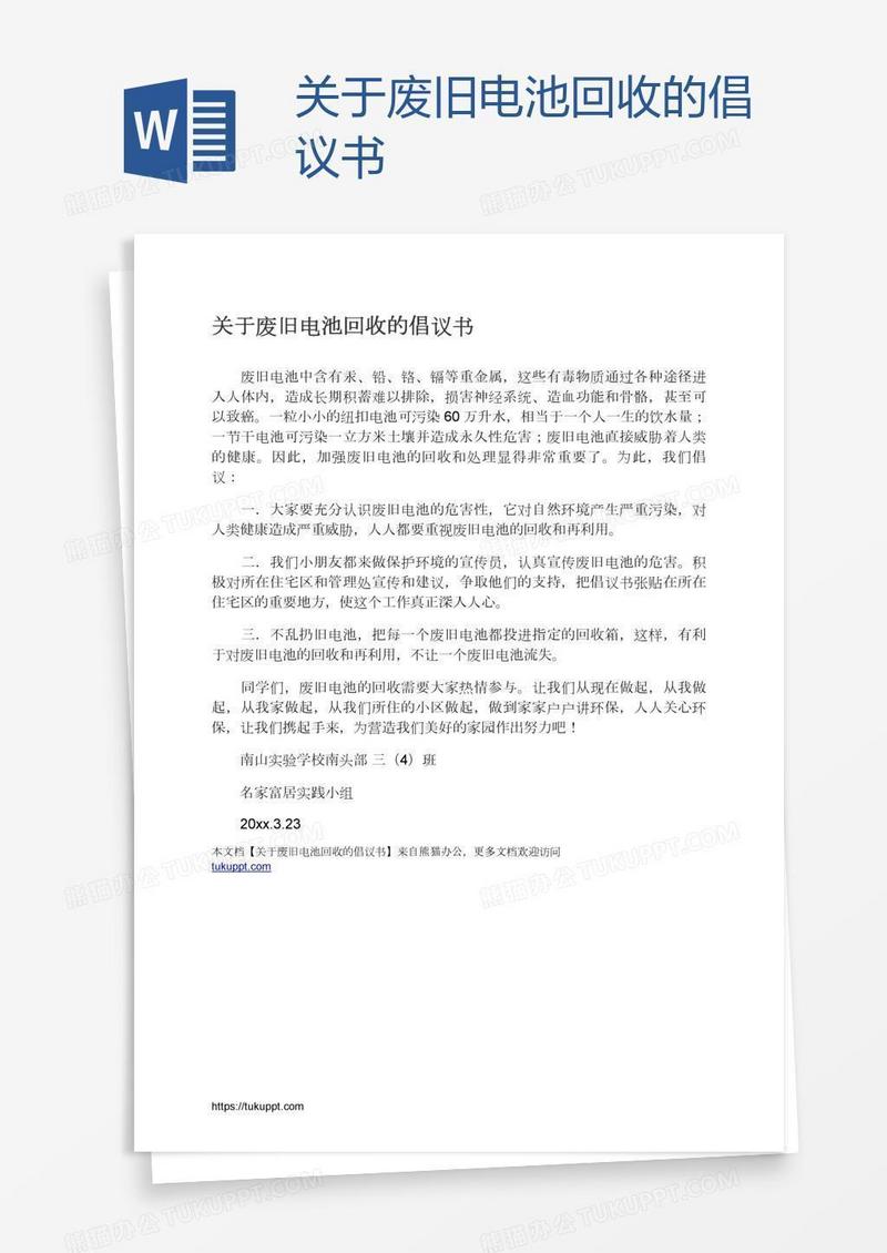 本作品为关于废旧电池回收的倡议书, 编号:wavqd2ke79, 格式为 docx, 大小1 MB, 本作品下载后,先解压,解压之后用推荐软件 Word(2010) 打开, 然后进行编辑功能。