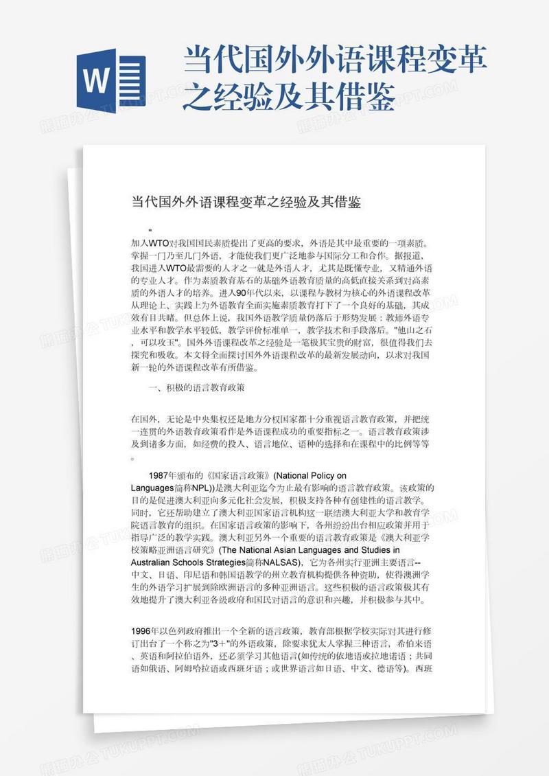 本作品为当代国外外语课程变革之经验及其借鉴, 编号:wavqd55g29, 格式为 docx, 大小1 MB, 本作品下载后,先解压,解压之后用推荐软件 Word(2010) 打开, 然后进行编辑功能。