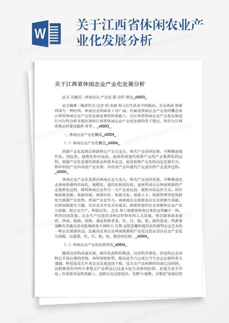 本作品为关于江西省休闲农业产业化发展分析, 编号:wavqde35w9, 格式为 docx, 大小1 MB, 本作品下载后,先解压,解压之后用推荐软件 Word(2010) 打开, 然后进行编辑功能。
