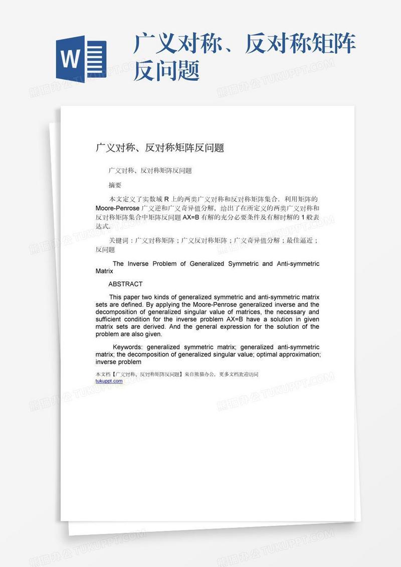 本作品为广义对称、反对称矩阵反问题, 编号:wavqde47w9, 格式为 docx, 大小1 MB, 本作品下载后,先解压,解压之后用推荐软件 Word(2010) 打开, 然后进行编辑功能。