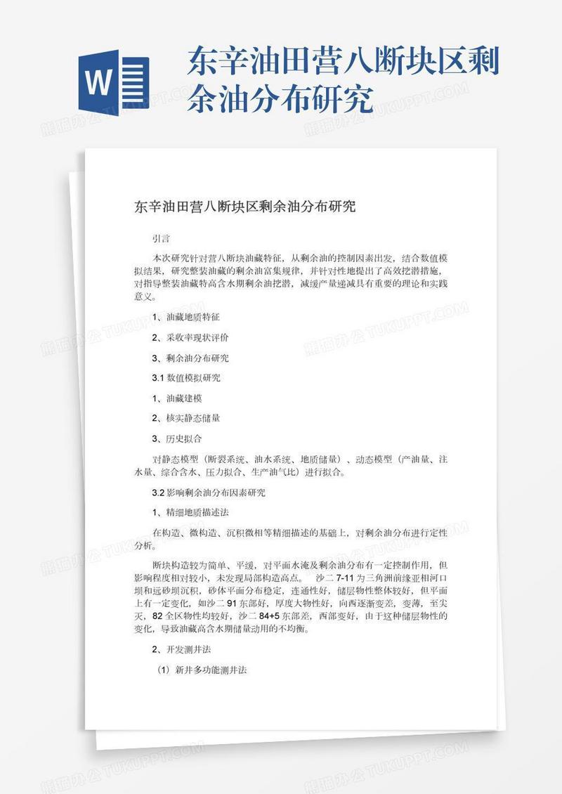 本作品为东辛油田营八断块区剩余油分布研究, 编号:wavqdebqb9, 格式为 docx, 大小1 MB, 本作品下载后,先解压,解压之后用推荐软件 Word(2010) 打开, 然后进行编辑功能。