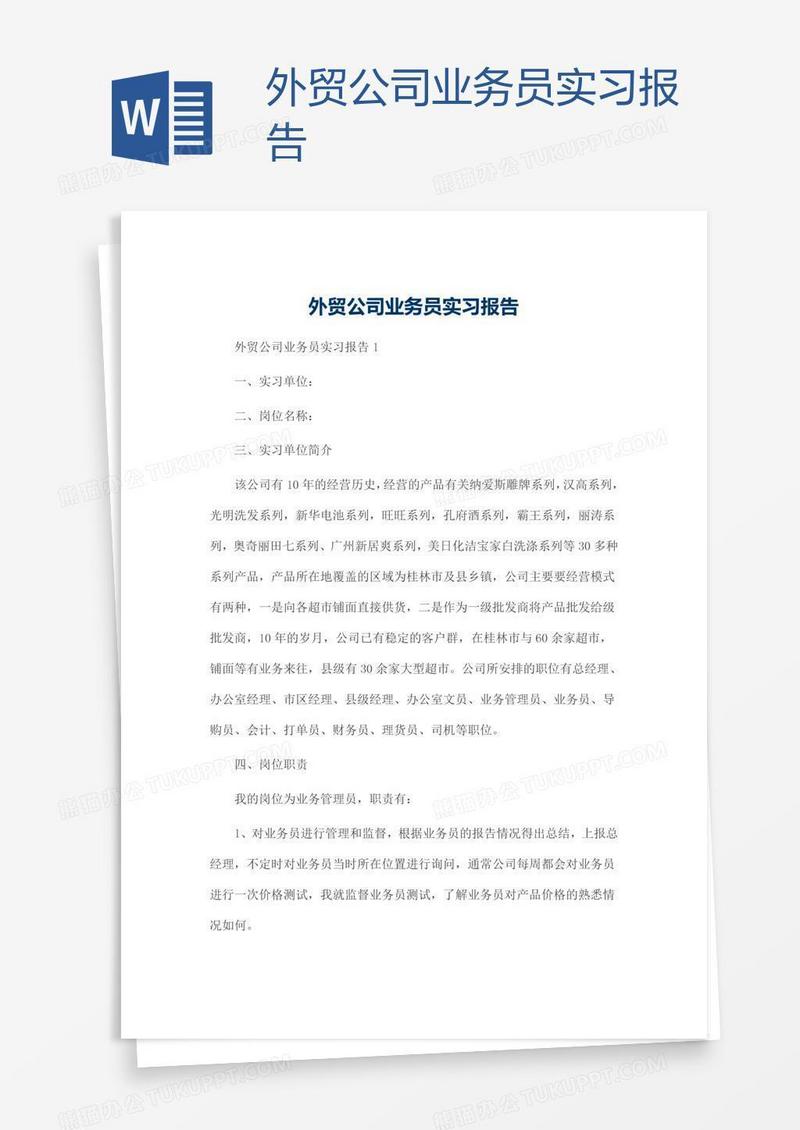 本作品为外贸公司业务员实习报告, 编号:wavqdj6dr9, 格式为 docx, 大小1 MB, 本作品下载后,先解压,解压之后用推荐软件 Word(2010) 打开, 然后进行编辑功能。