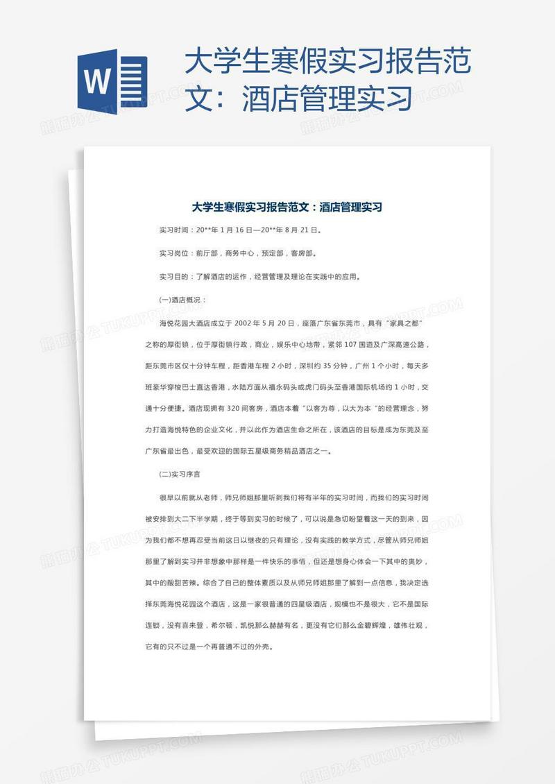 本作品为大学生寒假实习报告范文:酒店管理实习, 编号:wavqdjp2w9, 格式为 docx, 大小1 MB, 本作品下载后,先解压,解压之后用推荐软件 Word(2010) 打开, 然后进行编辑功能。