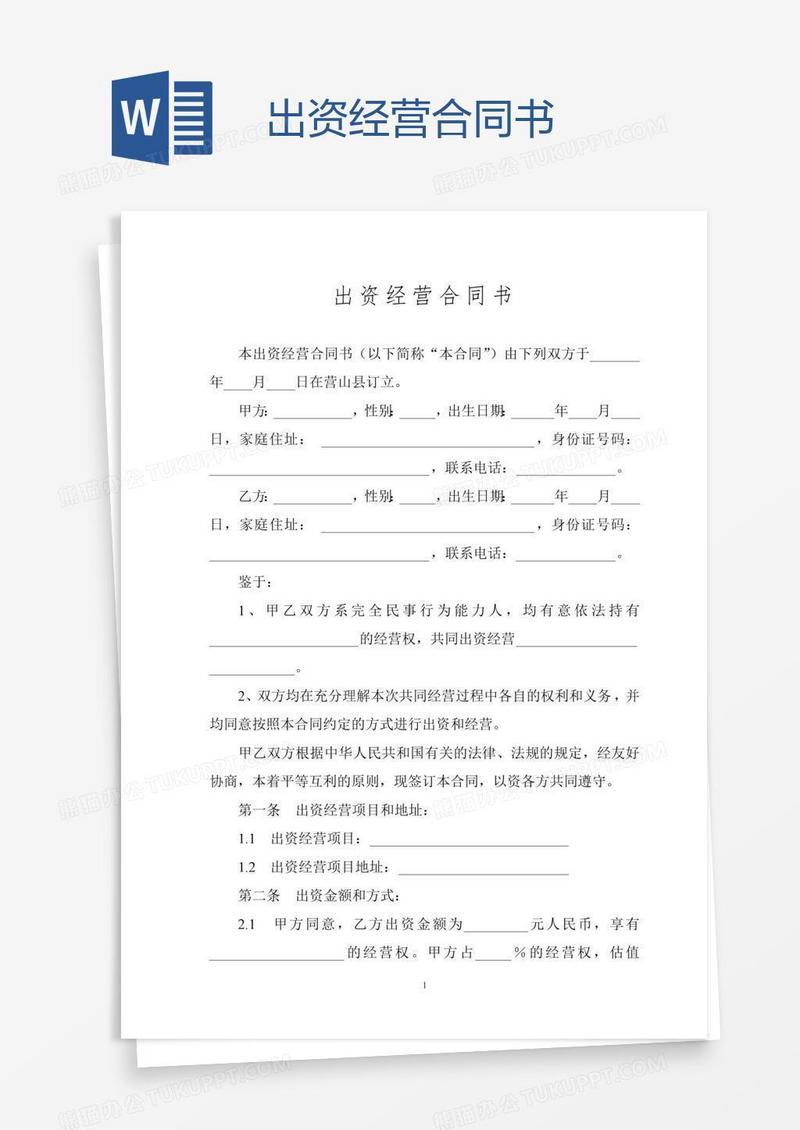 本作品为出资经营合同书, 编号:wavqdkyvw9, 格式为 docx, 大小1 MB, 本作品下载后,先解压,解压之后用推荐软件 Word(2010) 打开, 然后进行编辑功能。