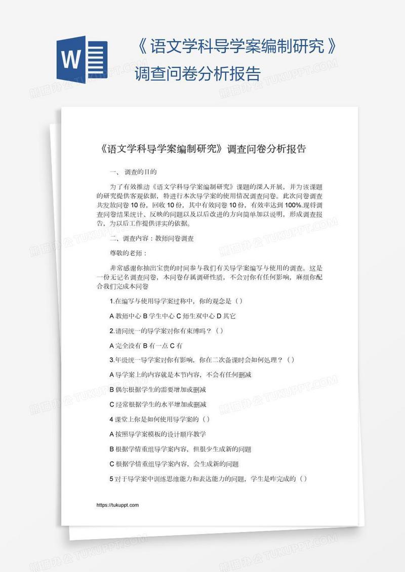 本作品为《语文学科导学案编制研究》调查问卷分析报告, 编号:wavqdo4v79, 格式为 docx, 大小1 MB, 本作品下载后,先解压,解压之后用推荐软件 Word(2010) 打开, 然后进行编辑功能。