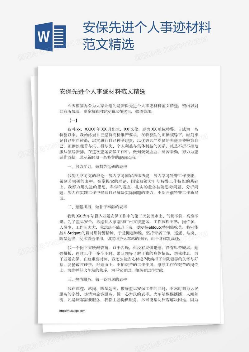 本作品为安保先进个人事迹材料范文精选, 编号:wavqdpjg79, 格式为 docx, 大小1 MB, 本作品下载后,先解压,解压之后用推荐软件 Word(2010) 打开, 然后进行编辑功能。