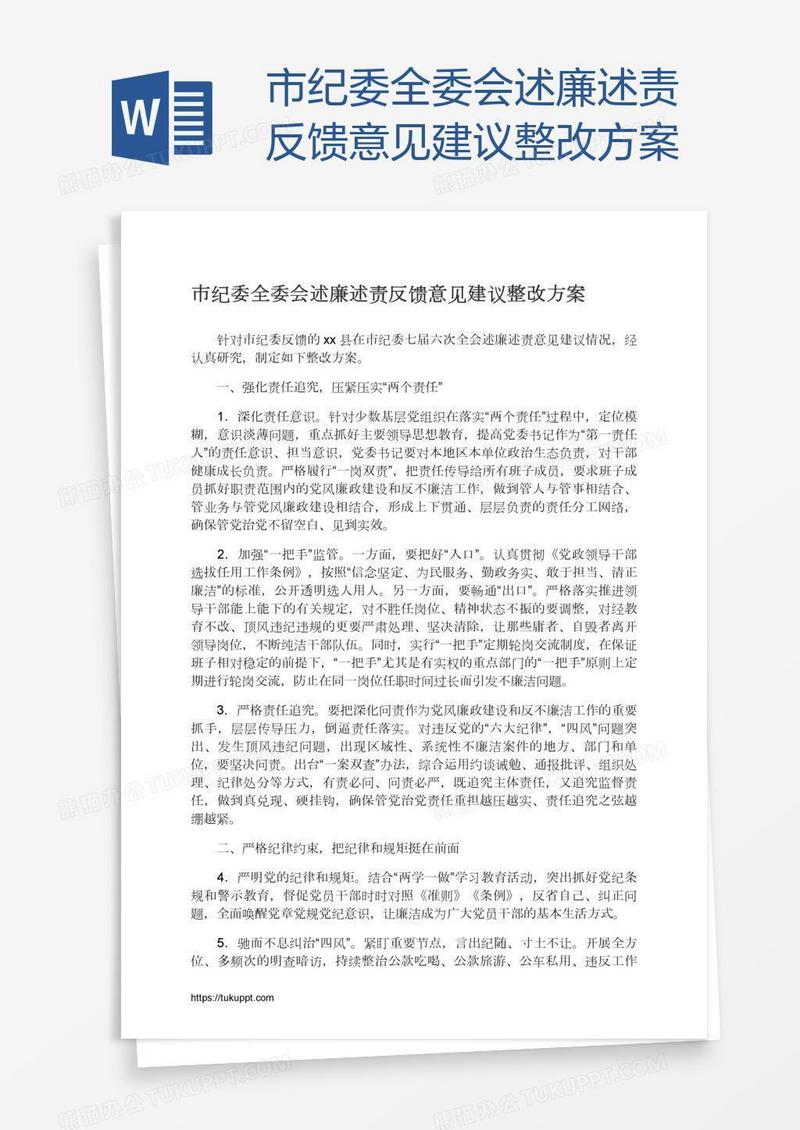 本作品为市纪委全委会述廉述责反馈意见建议整改方案, 编号:wavqdpy8b9, 格式为 docx, 大小1 MB, 本作品下载后,先解压,解压之后用推荐软件 Word(2010) 打开, 然后进行编辑功能。