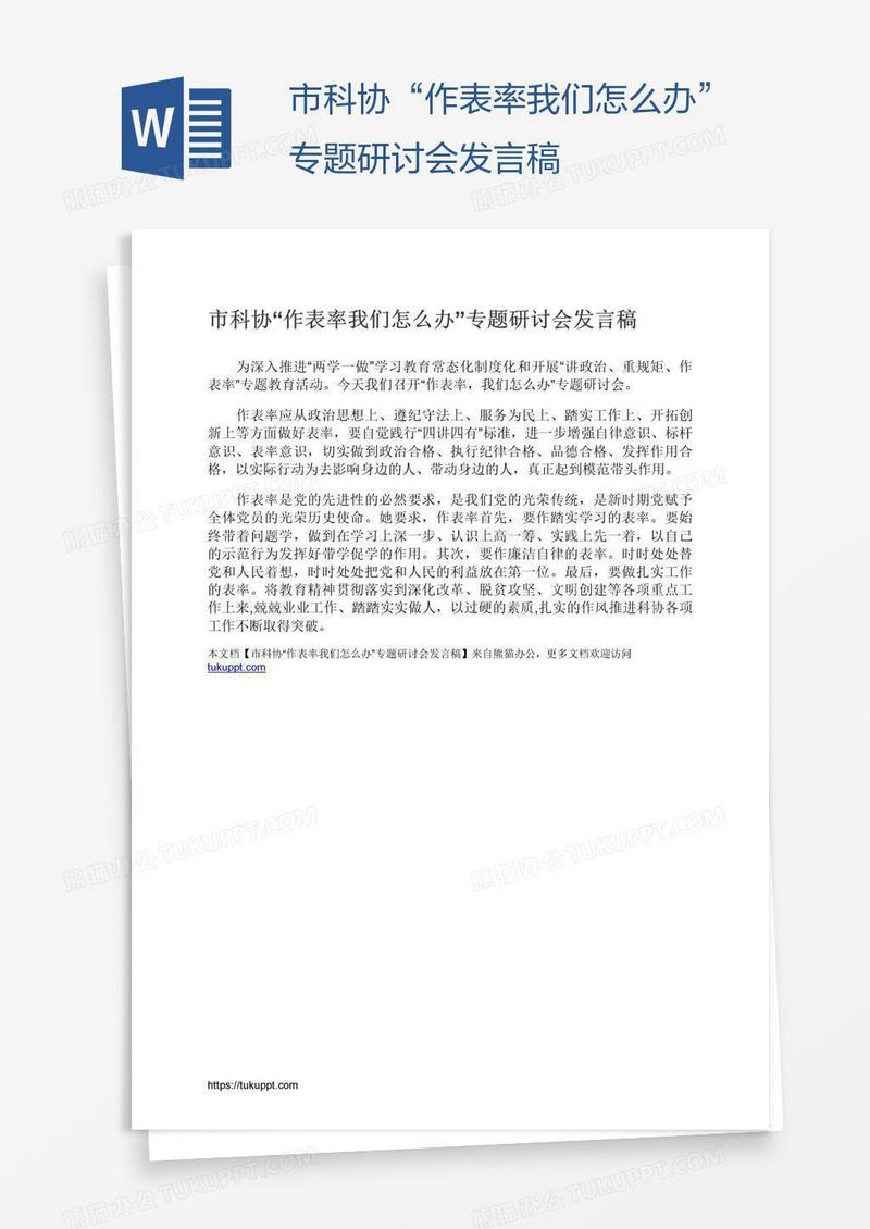 本作品为市科协“作表率我们怎么办”专题研讨会发言稿, 编号:wavqdvgk79, 格式为 docx, 大小1 MB, 本作品下载后,先解压,解压之后用推荐软件 Word(2010) 打开, 然后进行编辑功能。