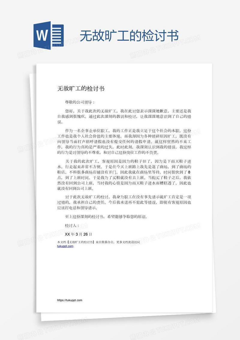 本作品为无故旷工的检讨书, 编号:wavqdwm379, 格式为 docx, 大小1 MB, 本作品下载后,先解压,解压之后用推荐软件 Word(2010) 打开, 然后进行编辑功能。