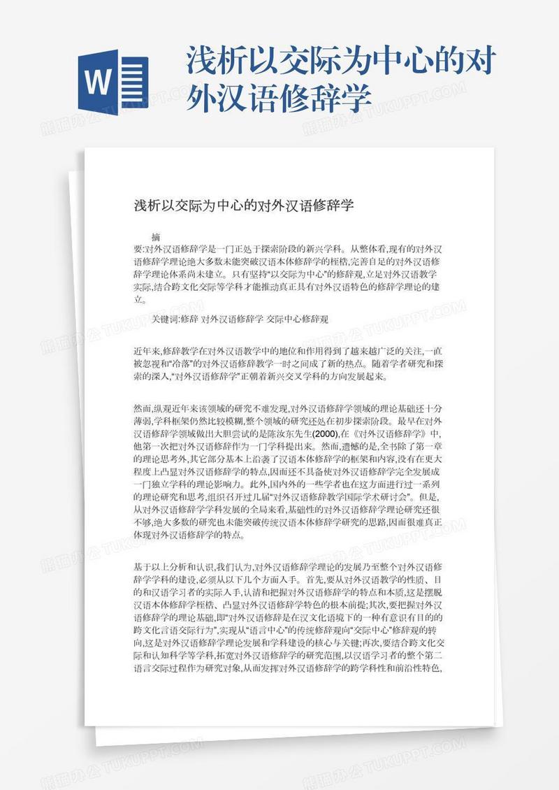 本作品为浅析以交际为中心的对外汉语修辞学, 编号:wavqo2rgr9, 格式为 docx, 大小1 MB, 本作品下载后,先解压,解压之后用推荐软件 Word(2010) 打开, 然后进行编辑功能。