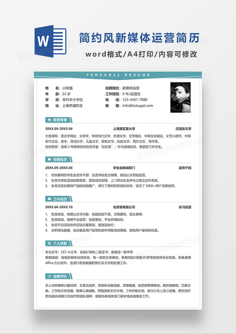 本作品为绿色简洁新媒体运营简历求职简历WORD模板, 编号:wavqog5v79, 格式为 docx, 大小3 MB, 本作品下载后,先解压,解压之后用推荐软件 Word(2019) 打开, 然后进行编辑功能。
