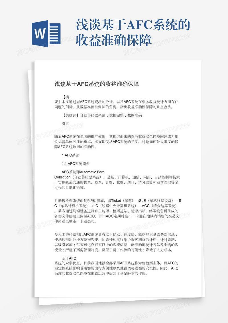 本作品为浅谈基于AFC系统的收益准确保障, 编号:wavqoo4r79, 格式为 docx, 大小1 MB, 本作品下载后,先解压,解压之后用推荐软件 Word(2010) 打开, 然后进行编辑功能。