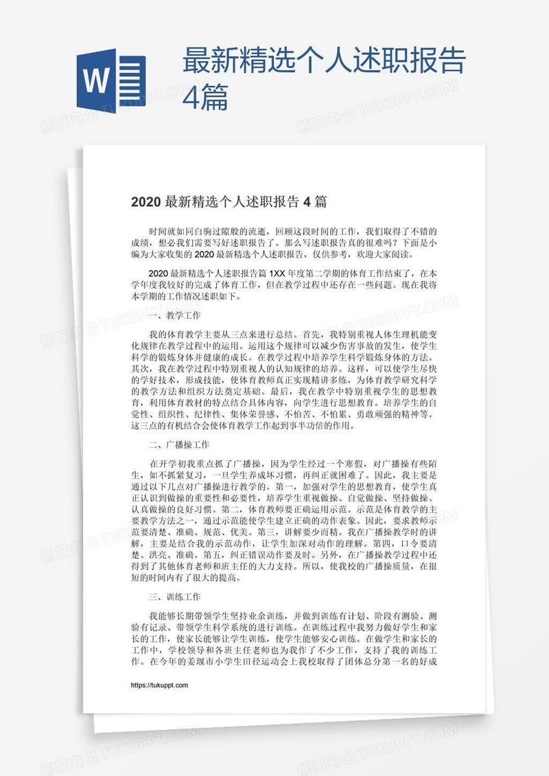 本作品为最新精选个人述职报告4篇, 编号:wavqp03rw9, 格式为 docx, 大小1 MB, 本作品下载后,先解压,解压之后用推荐软件 Word(2010) 打开, 然后进行编辑功能。