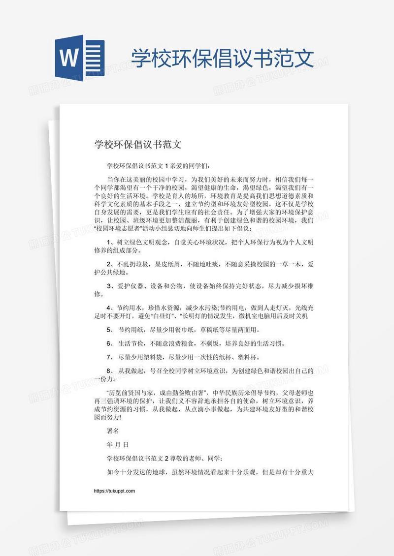 本作品为学校环保倡议书范文, 编号:wavqp3be79, 格式为 docx, 大小1 MB, 本作品下载后,先解压,解压之后用推荐软件 Word(2010) 打开, 然后进行编辑功能。