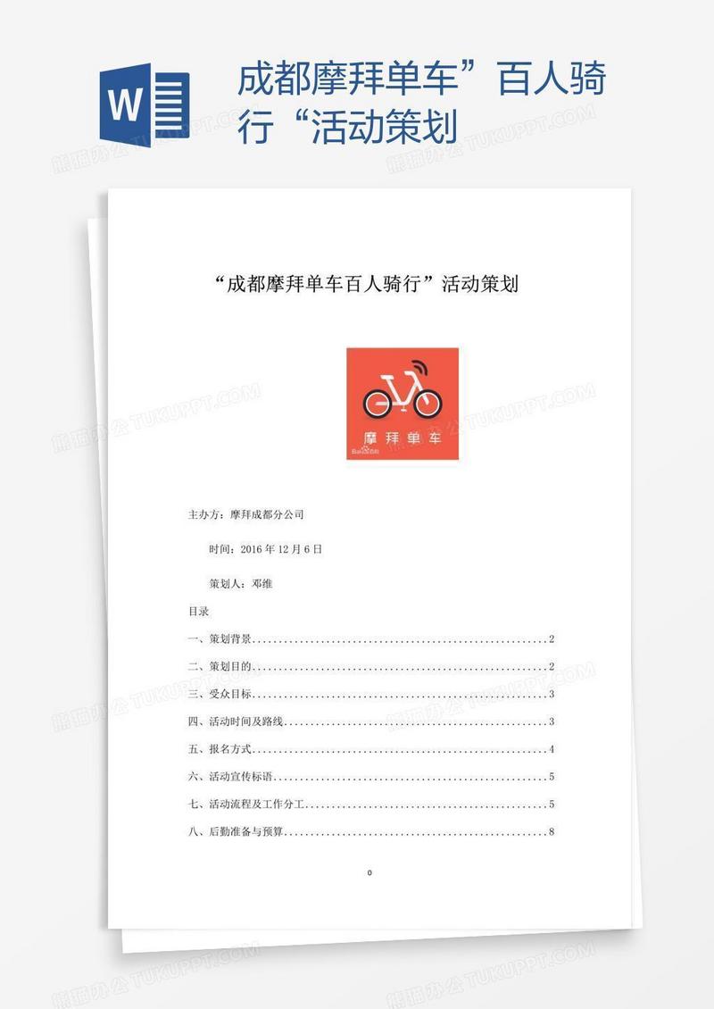 本作品为成都摩拜单车”百人骑行“活动策划, 编号:wavqp7yp29, 格式为 docx, 大小1 MB, 本作品下载后,先解压,解压之后用推荐软件 Word(2010) 打开, 然后进行编辑功能。