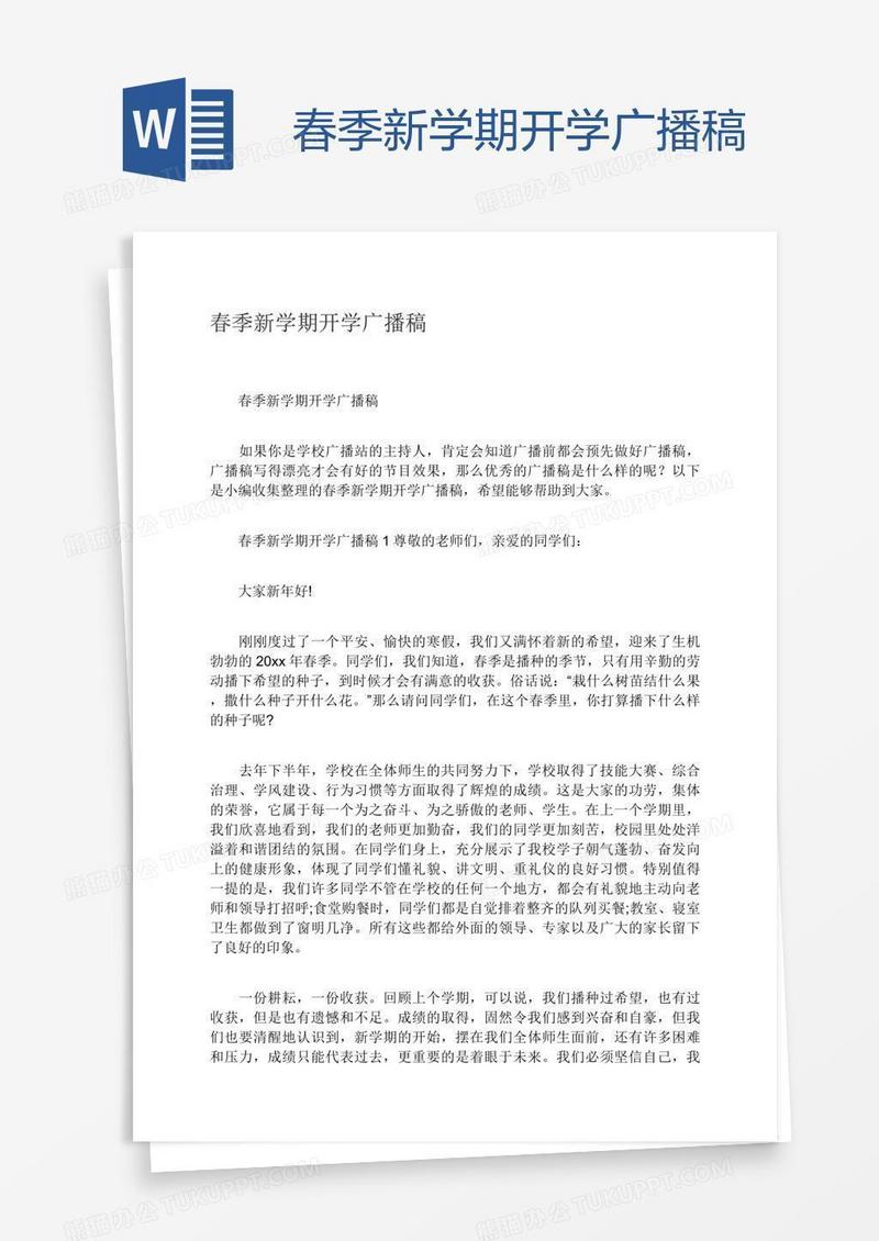 本作品为春季新学期开学广播稿, 编号:wavqpbpnd9, 格式为 docx, 大小1 MB, 本作品下载后,先解压,解压之后用推荐软件 Word(2010) 打开, 然后进行编辑功能。