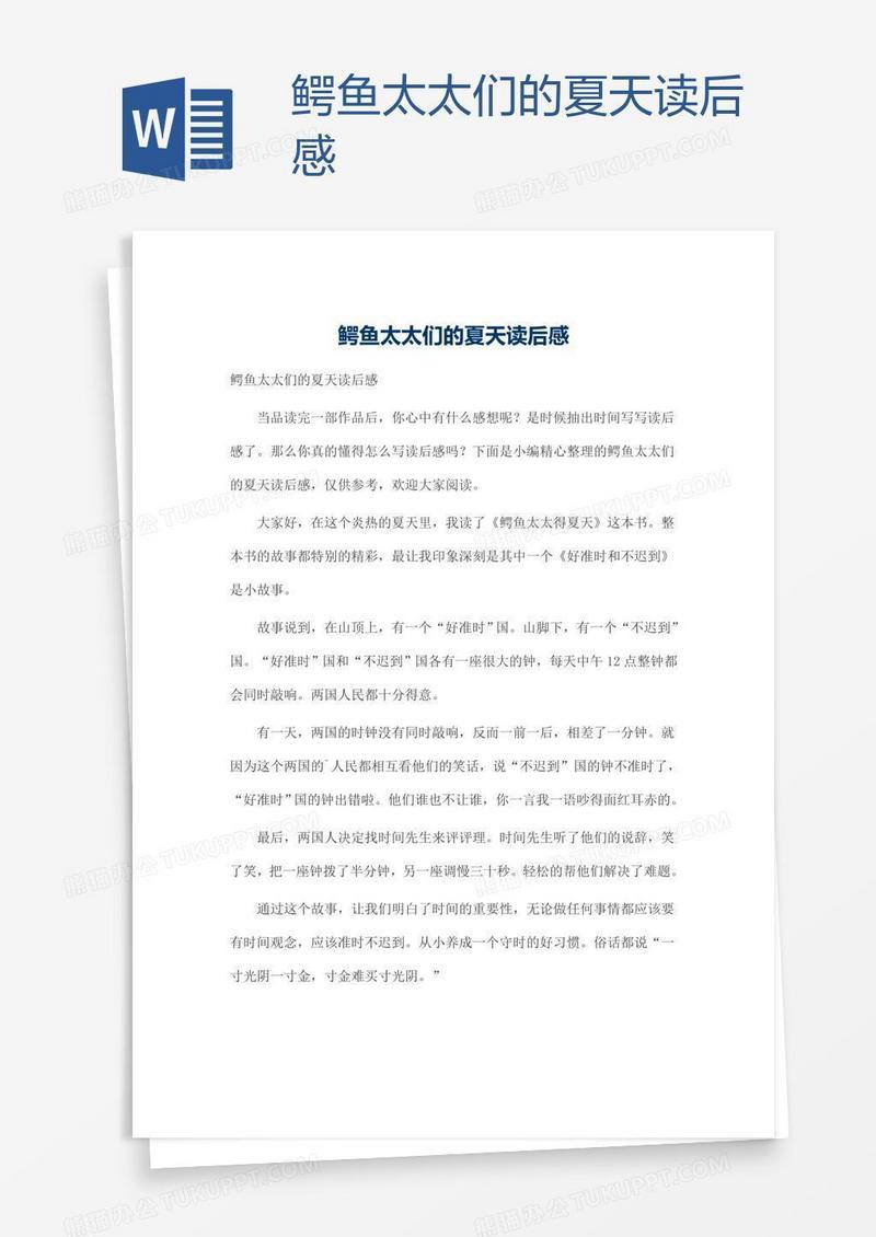 本作品为鳄鱼太太们的夏天读后感, 编号:wavqpk47r9, 格式为 docx, 大小1 MB, 本作品下载后,先解压,解压之后用推荐软件 Word(2010) 打开, 然后进行编辑功能。