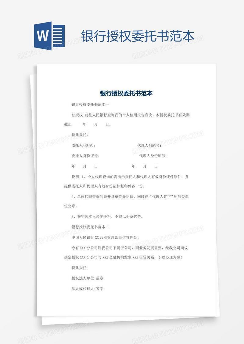 本作品为银行授权委托书范本, 编号:wavqpkr2d9, 格式为 docx, 大小1 MB, 本作品下载后,先解压,解压之后用推荐软件 Word(2010) 打开, 然后进行编辑功能。