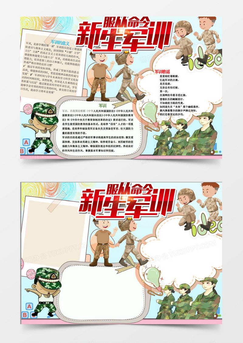 本作品为卡通可爱新生军训小报手抄报word模板, 编号:wavqpopq29, 格式为 wps, 大小3 MB, 本作品下载后,先解压,解压之后用推荐软件 Word(2016) 打开, 然后进行编辑功能。