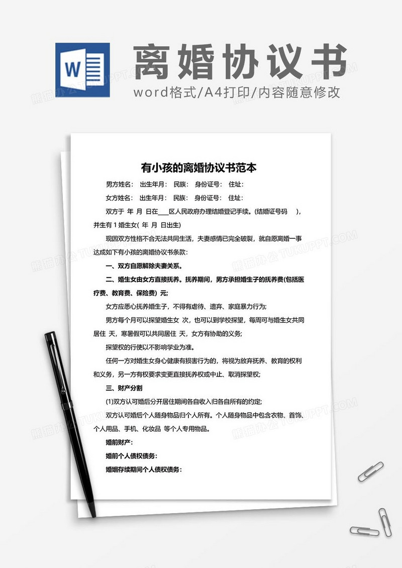 本作品为有小孩离婚协议书范文word模板, 编号:wavqpry3b9, 格式为 docx, 大小1 MB, 本作品下载后,先解压,解压之后用推荐软件 Word(2013) 打开, 然后进行编辑功能。